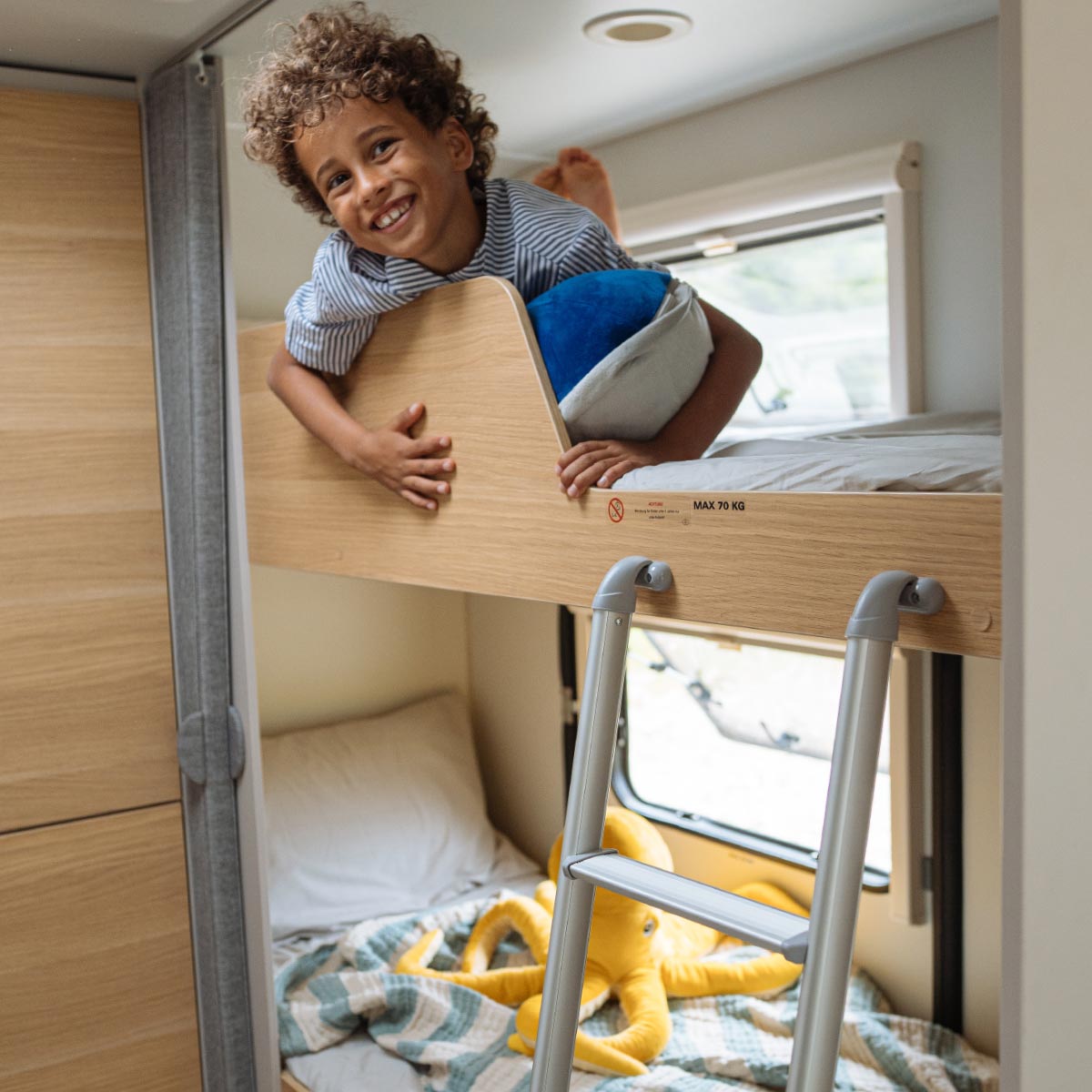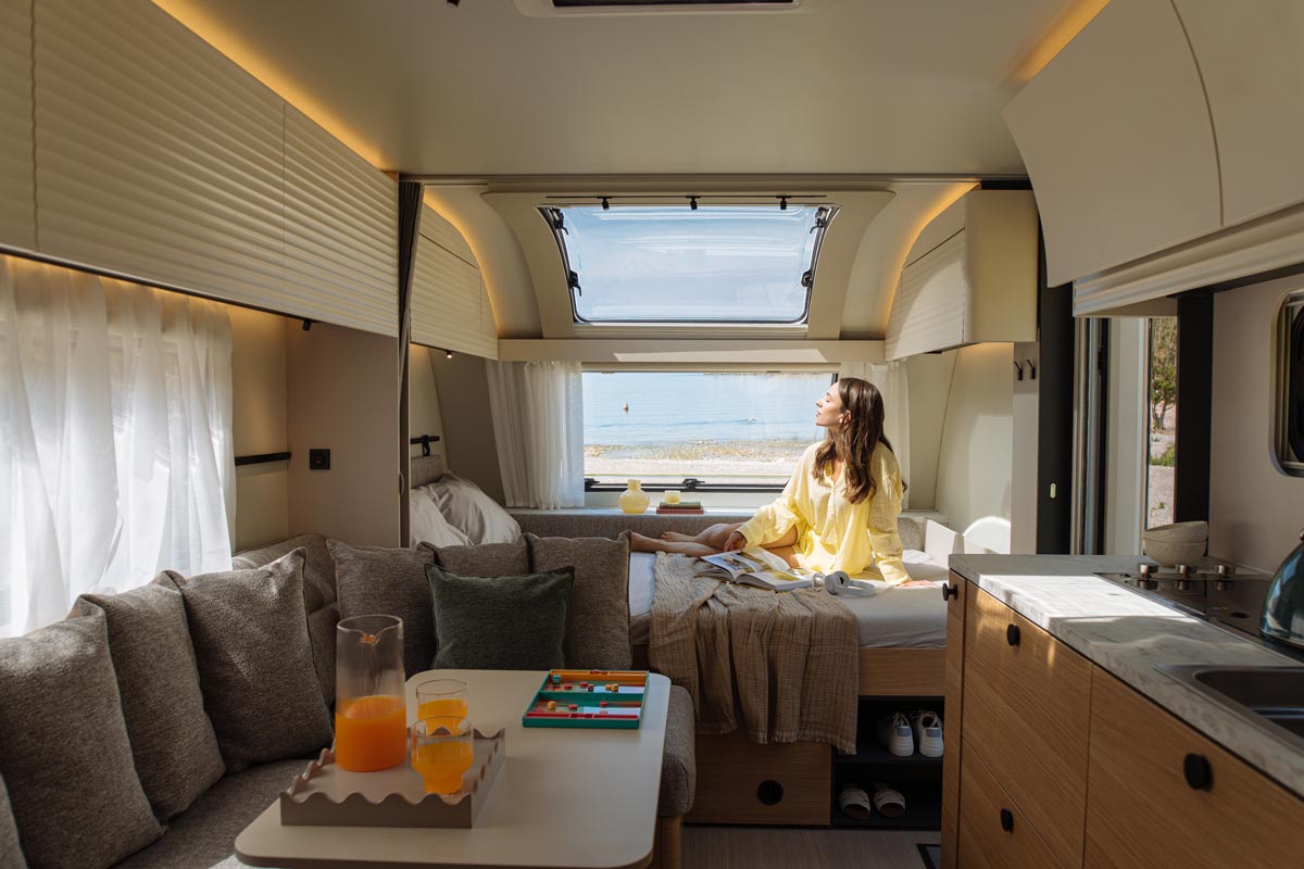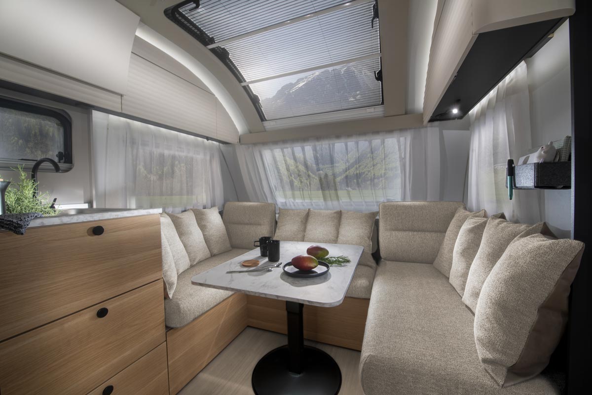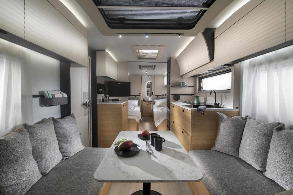 In ogni zona living troverete un comfort senza pari. Il design della cucina e del bagno è nuovo, con piani di lavoro in simil marmo e accessori neri. I sedili sono nuovi, con schienale mobile e poggiatesta migliorati. Sono presenti nuovi mobili e un tavolo da pranzo in simil marmo. Le camere da letto sono dotate di letti più alti e facilmente accessibili, dotati di nuovi poggiatesta e materassi Evopore®, anche sui letti a castello. Lo spazio di stivaggio è ben organizzato. Per un utilizzo durante tutto l'anno, sono disponibili un isolamento avanzato, il riscaldamento Truma e Alde e un sistema di circolazione dell'aria che elimina i punti freddi; è disponibile anche l'aria condizionata come optional.