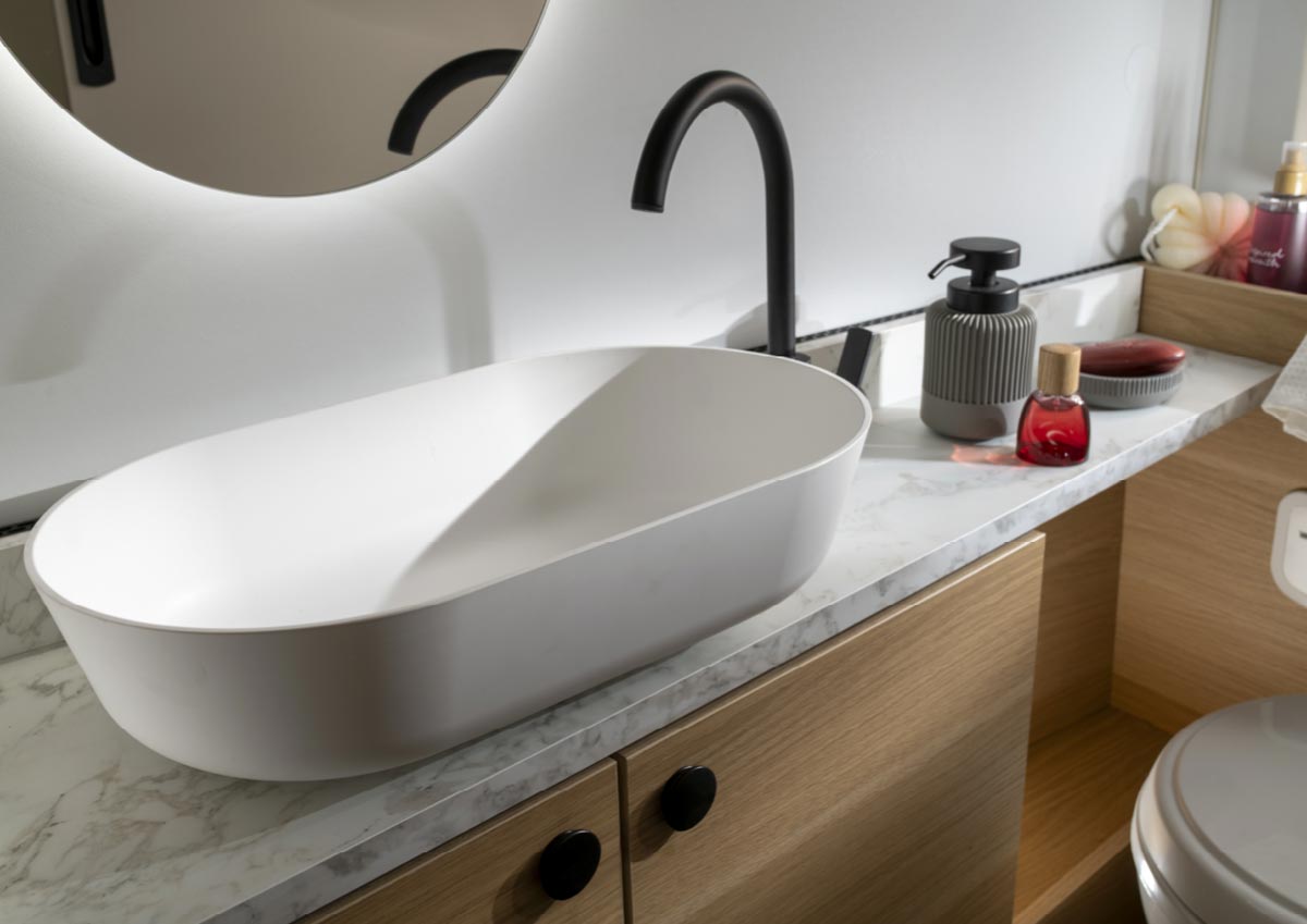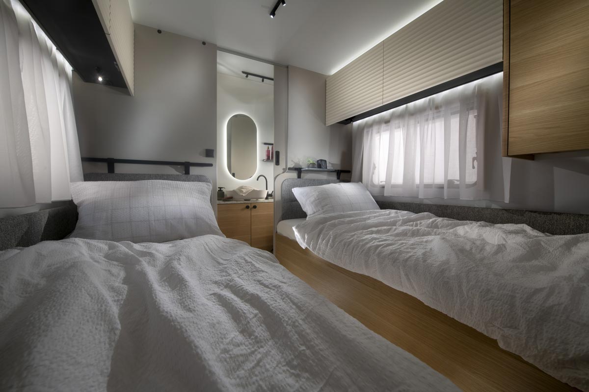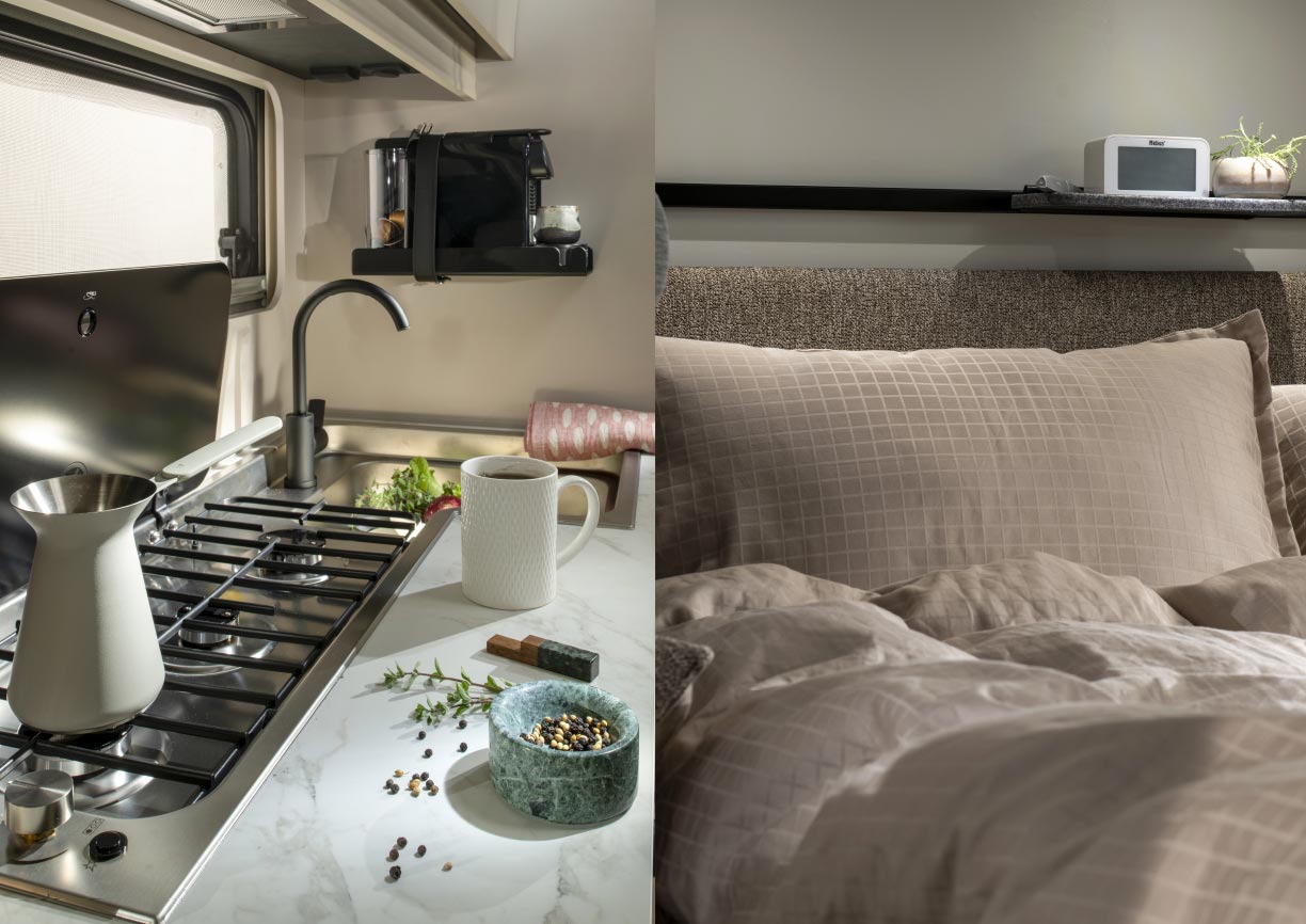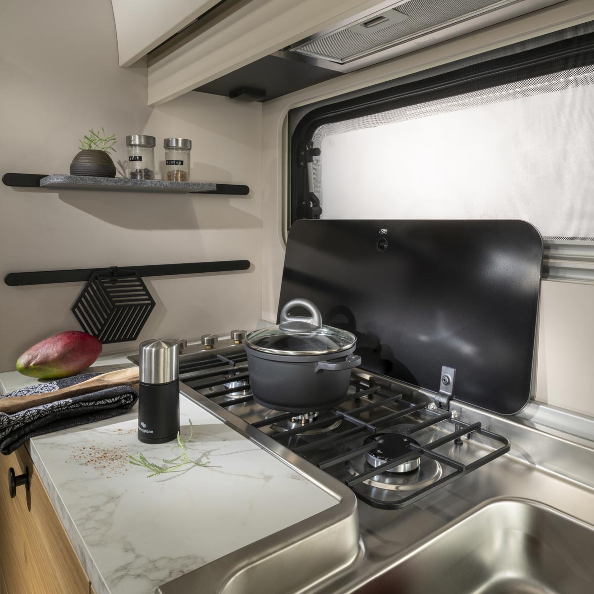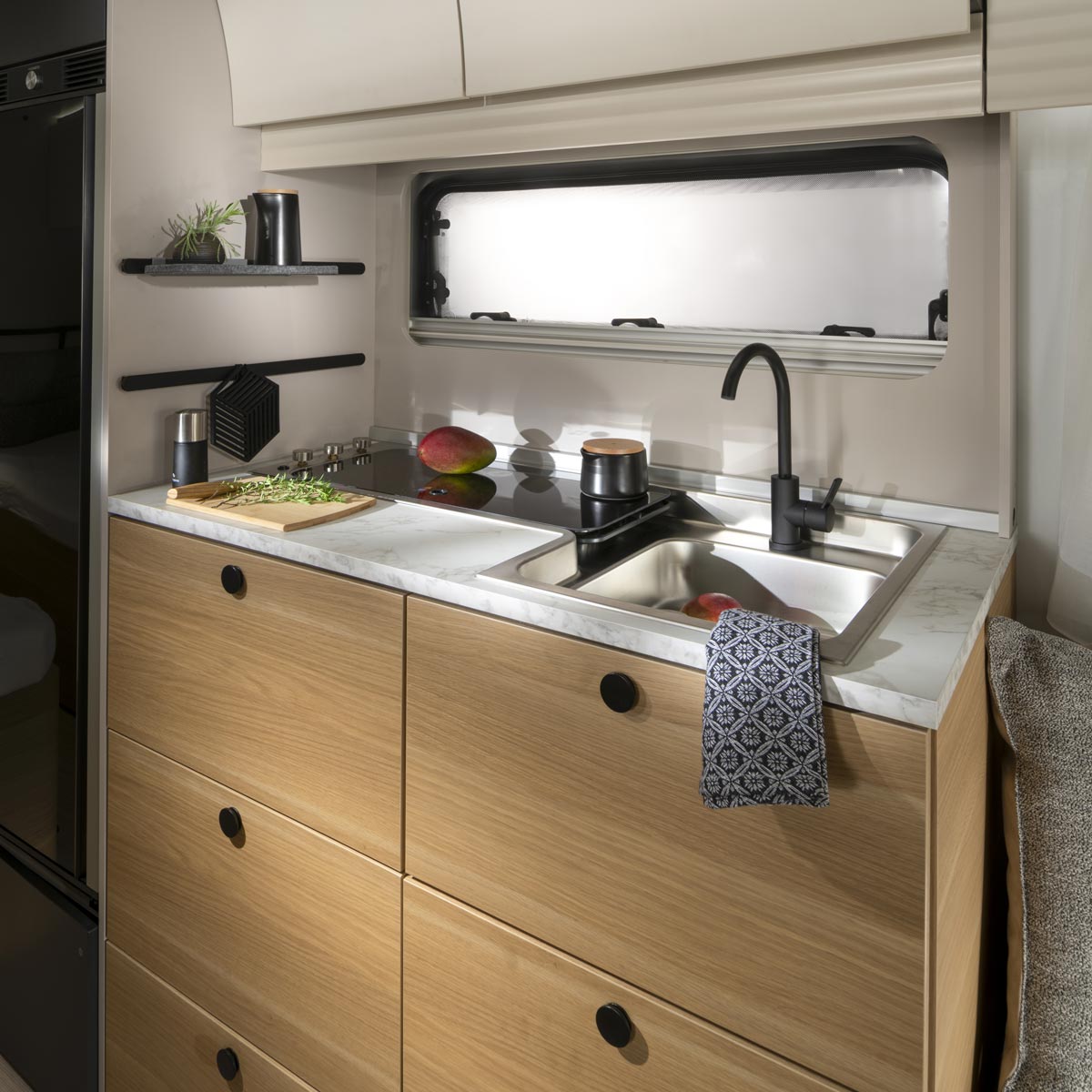 La cucina è stata migliorata con piano cottura, frigorifero a compressore da 157 litri, cassetti capienti con chiusura a pressione, piano di lavoro in simil marmo, il tutto piacevolmente impreziosito da rubinetto e dettagli neri. Il bagno è più spazioso, con WC Thetford, ampio lavandino con rubinetto nero su piano in simil marmo, nuovo specchio illuminato e spazio di stivaggio e colonna doccia Alde.