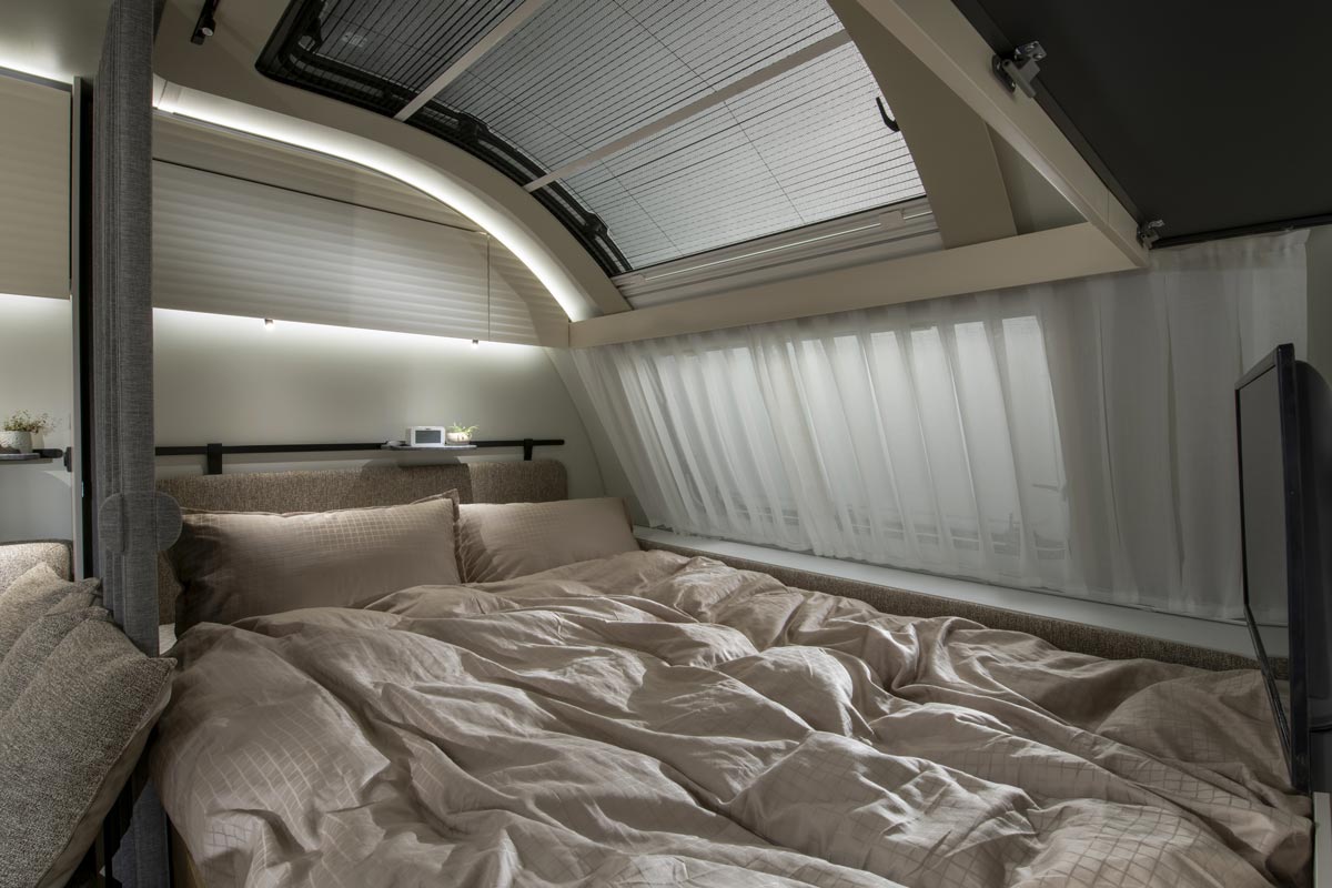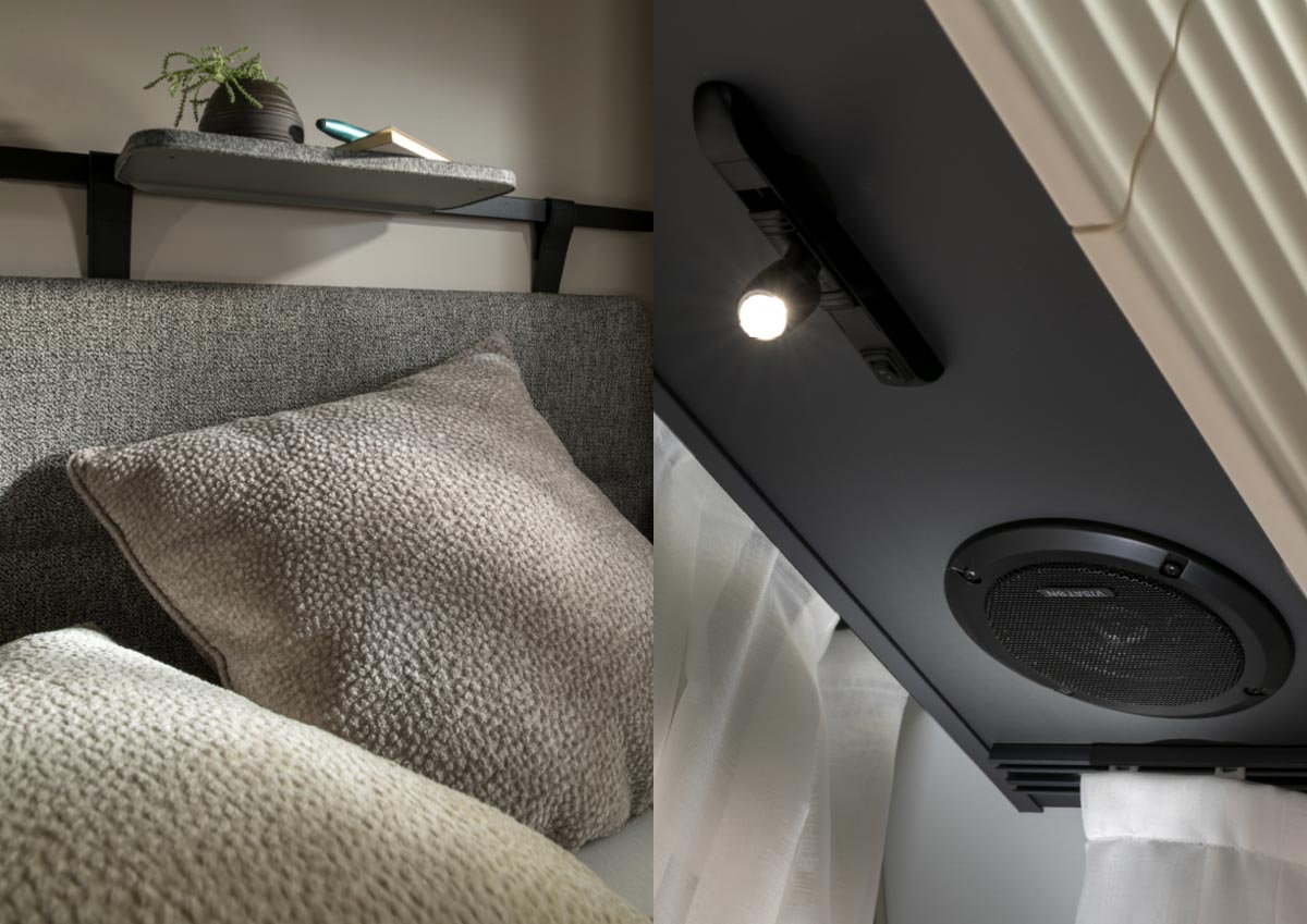 Tutto è stato studiato nei minimi dettagli, basando l'approccio sulla ricerca degli utenti. Ciò è visibile nel design dello schienale/poggiatesta e nel profilo dei pensili. I materiali sono di prima qualità e l'effetto è rilassante, con una sensazione di pregio. Aggiungete grandi funzionalità come il controller digitale facile da usare e l'app Adria MACH smart per il controllo remoto (come opzione). Tra le nuove opzioni figura il sistema audio Bluetooth® con subwoofer e altoparlanti integrati; questi dettagli semplificano la vita.