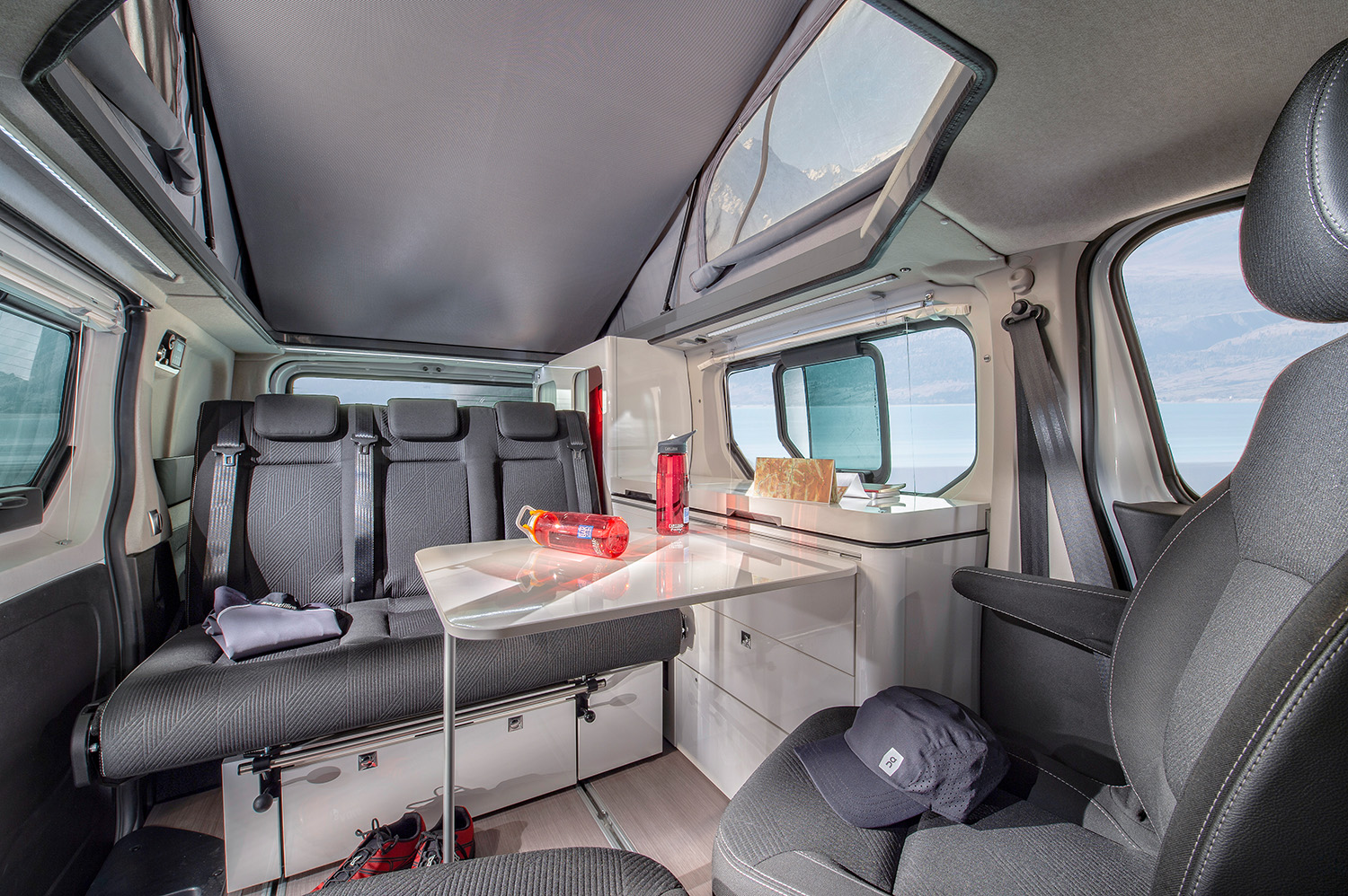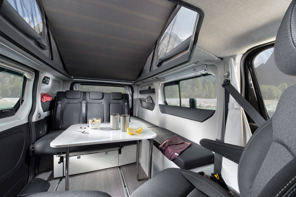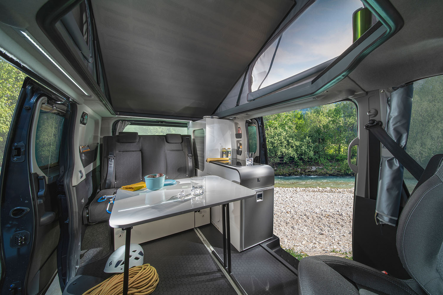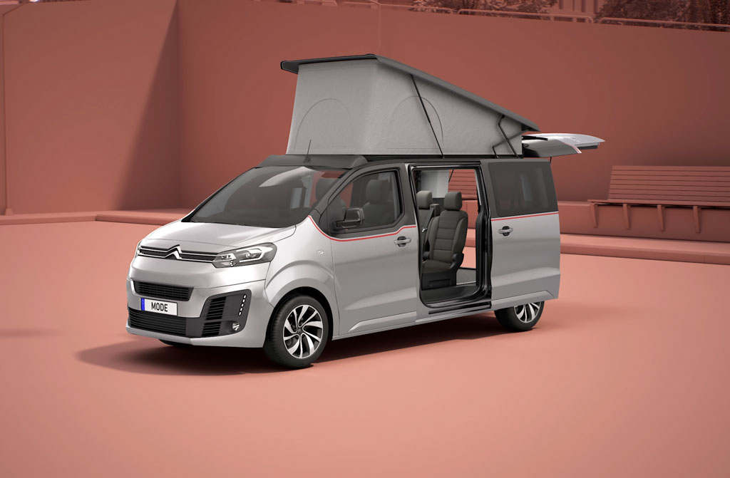 Specifica la tua auto base, l'acclamata Citroen Spacetourer, disponibile con motore, cambio manuale o automatico; e sistemazione integrata del tetto pop-top. Aggiungi il letto aggiuntivo facilmente installabile in auto. Aggiungi contenitori innovativi e soluzioni di stivaggio portatili e modulari. Aggiungi un tendalino e una tenda posteriore per avere ulteriore spazio living all'aperto.