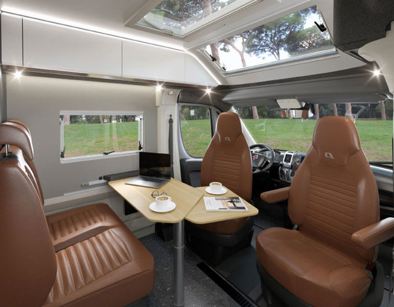 Adria presenta per la prima volta nuovi concetti di design per i camper più venduti Twin Supreme e Twin Sports. Si tratta di studi di progettazione con interni completamente nuovi, sul veicolo base Fiat Ducato, previsti per il rilascio futuro.